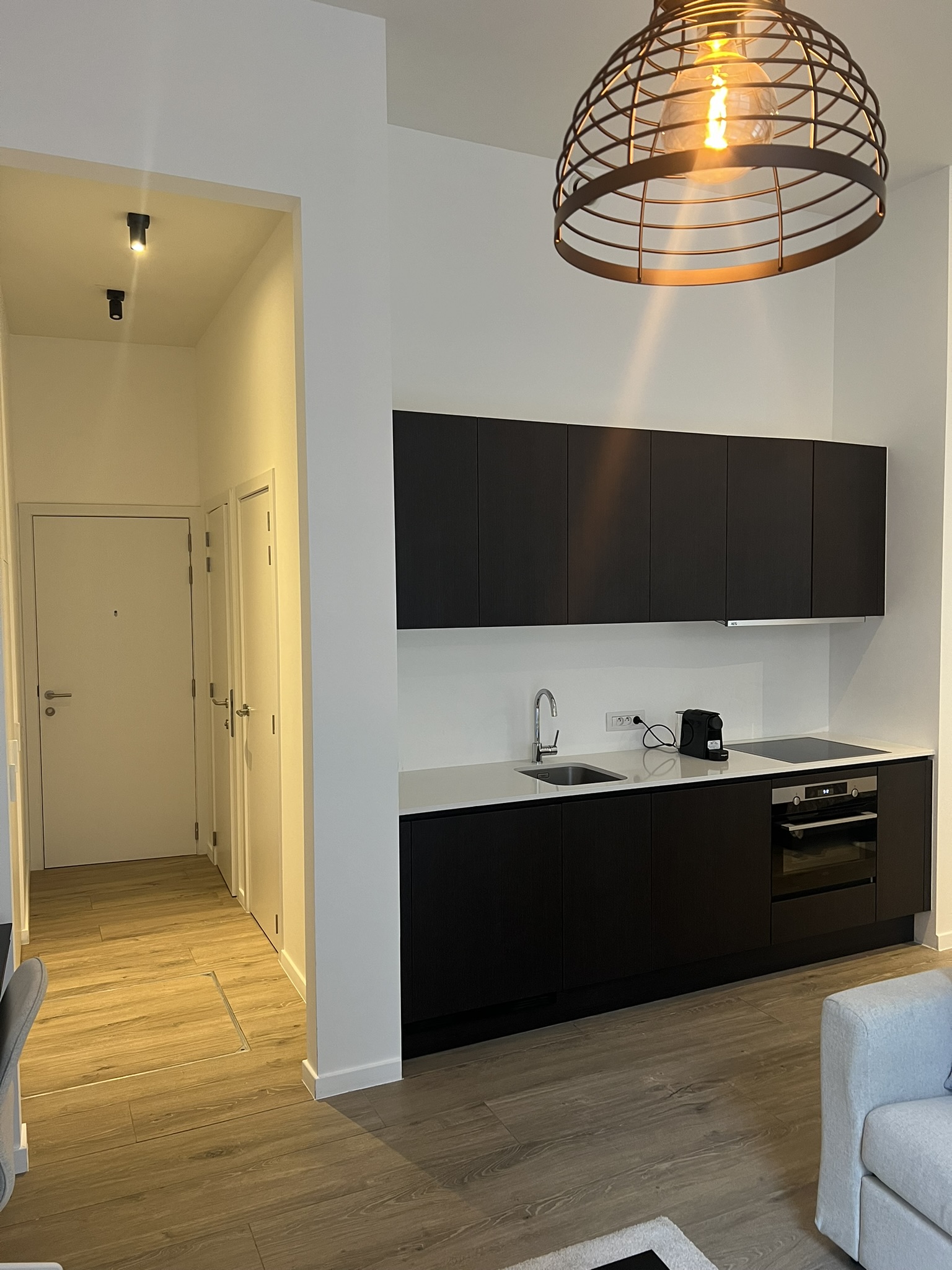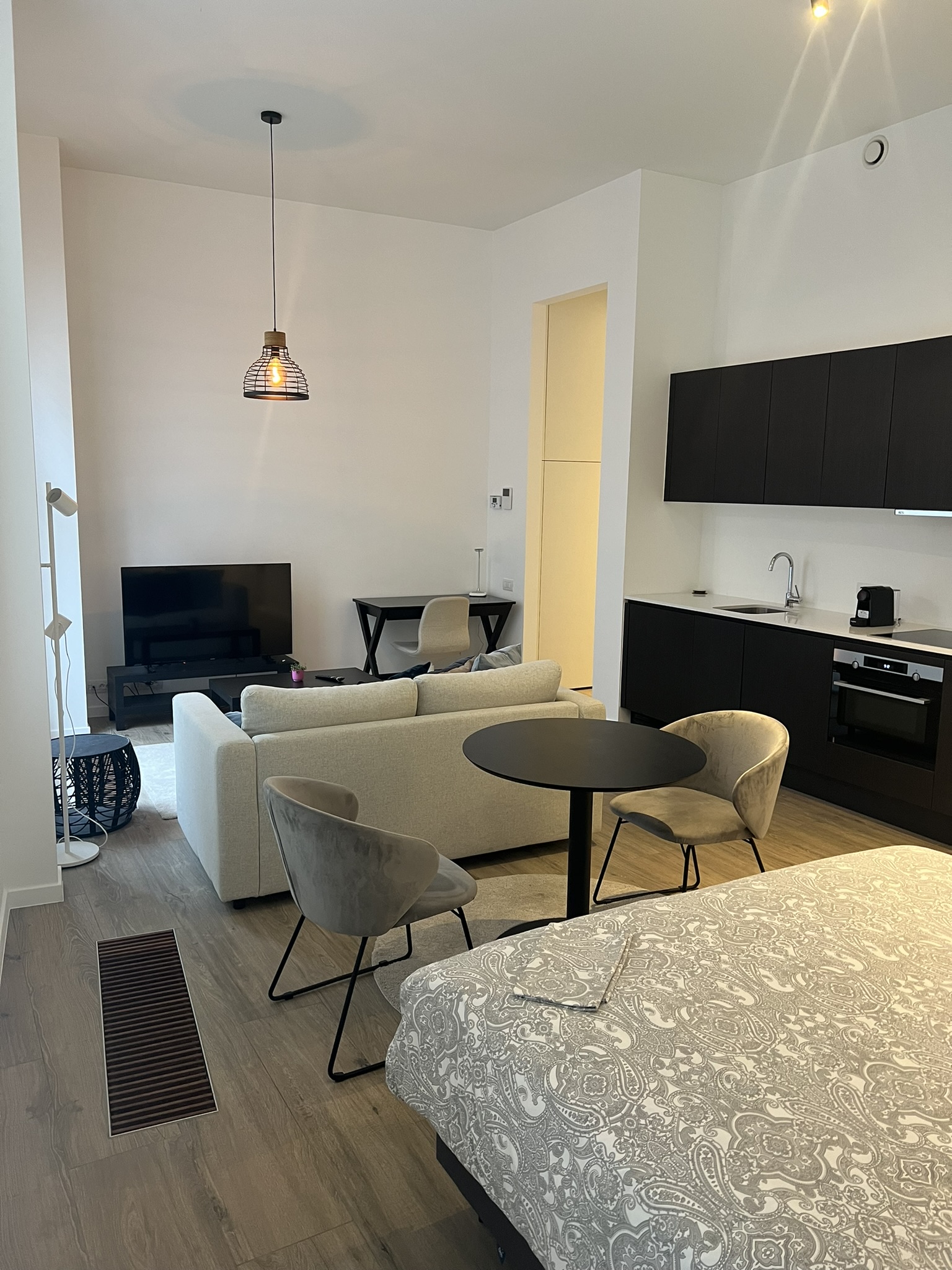 The furnished business studio offers a contemporary spacious stay with a fully equipped open kitchen, spacious and bright dining area and living room. The kitchen is fully equipped with a fridge, freezer, dishwasher, ceran cooker, microwave oven combo, extractor fan and capsule coffee machine.